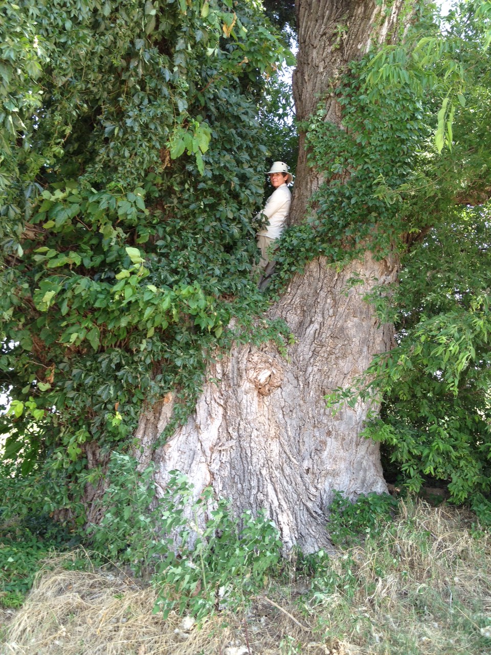 While in Sequoyah National Wildlife Refuge, along the Arkansas River in eastern Oklahoma, my colleague Debby Kaspari and I came cross this gigantic cottonwood tree. I saw some big cottonwoods along the banks of streams in Arizona which far outstripped anything I had seen in Oklahoma for size, but this one takes the prize! Climbing into the tree for a photo was a nonnegotiable for me, and I was able to use a couple of small trees behind this big one as climbing aids. The tree was draped with long, lush strands of Virginia creeper, which blew dramatically in the wind. It is difficult to effectively convey in a photograph the height of this great, and undoubtedly very old, living thing.