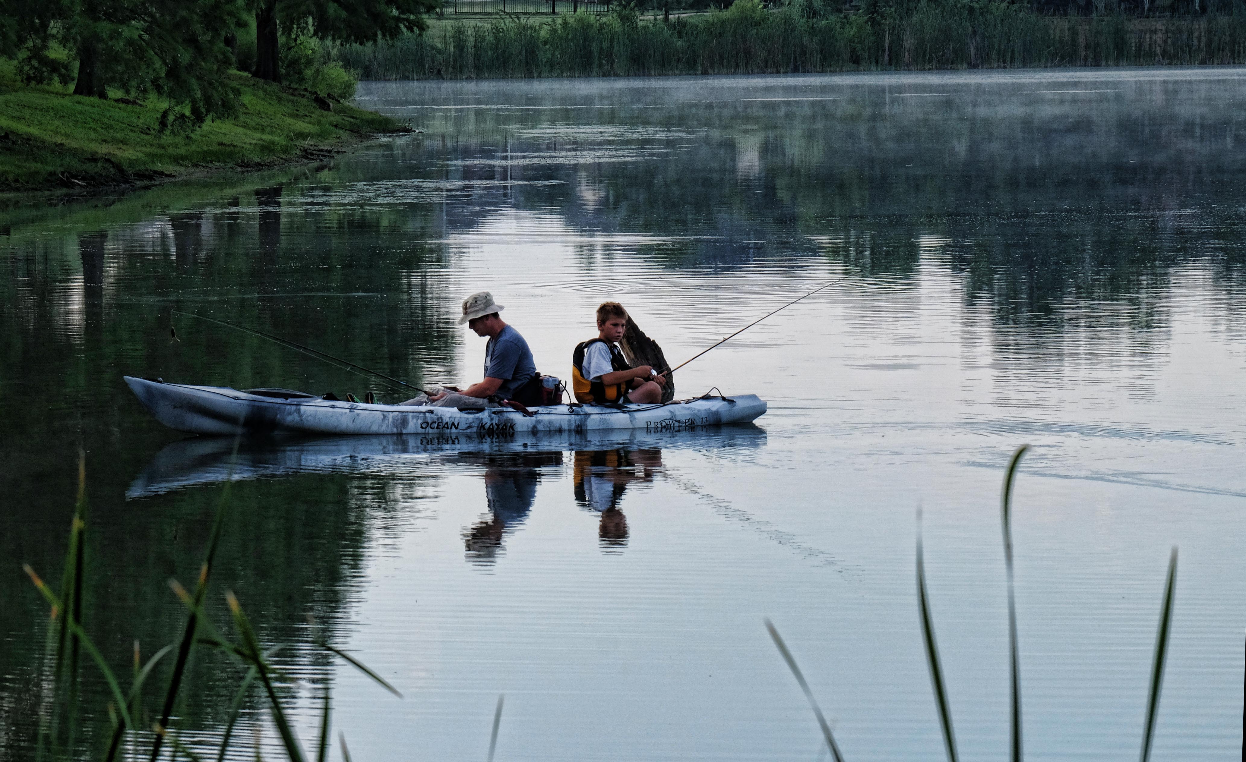 Father and son fishing, a slight mist still remaining in the background