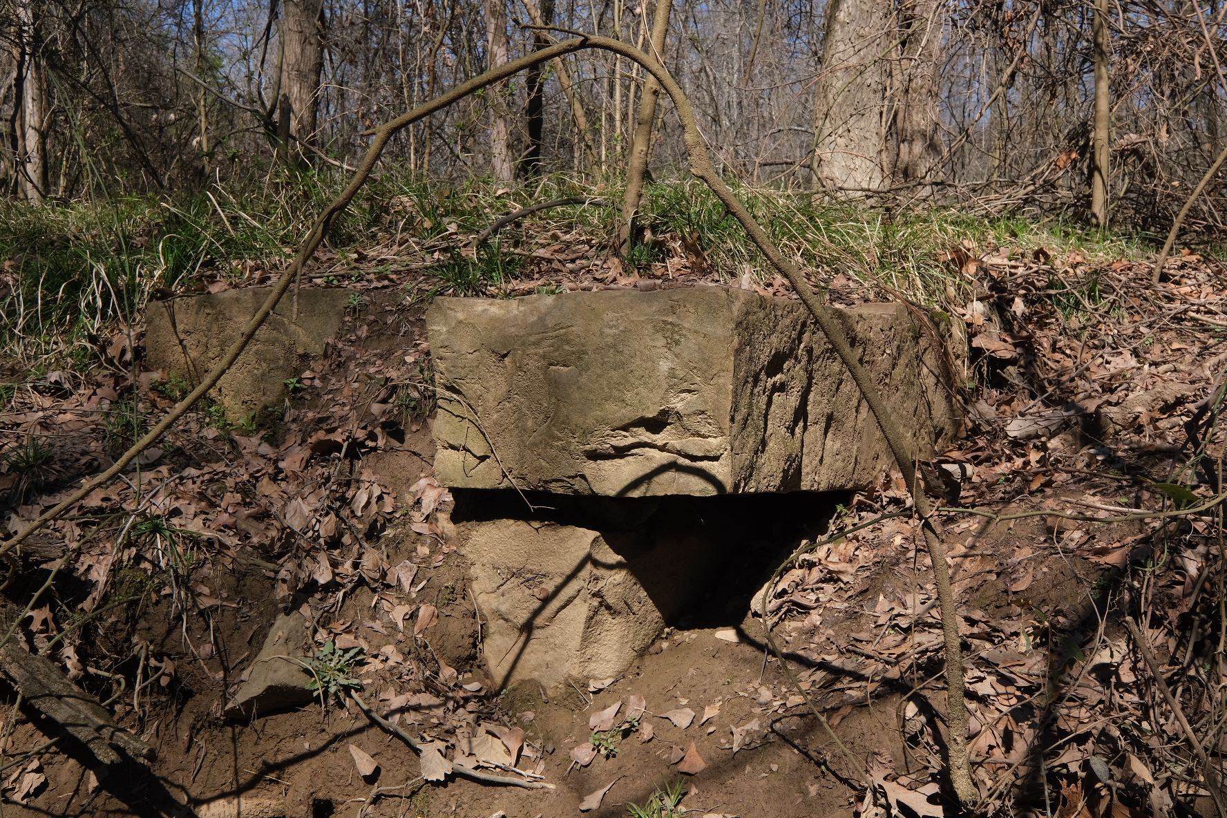 About 100 feet east of the spring is what looks like a dump. Modern detritus—55-gallon drums, a seat from a car, worn-out tires—congests and nearly conceals what on close examination is the foundation of a building perhaps 20 feet on its longest side. Large cut stones support the structure’s corners and support visible, but broken, floor joists. On a previous visit, I rejected this as a candidate for the Council House. It was too obvious, its upper layer too modern, the floor joists and nails certainly not of 1830s vintage. It isn’t what I expected to see.