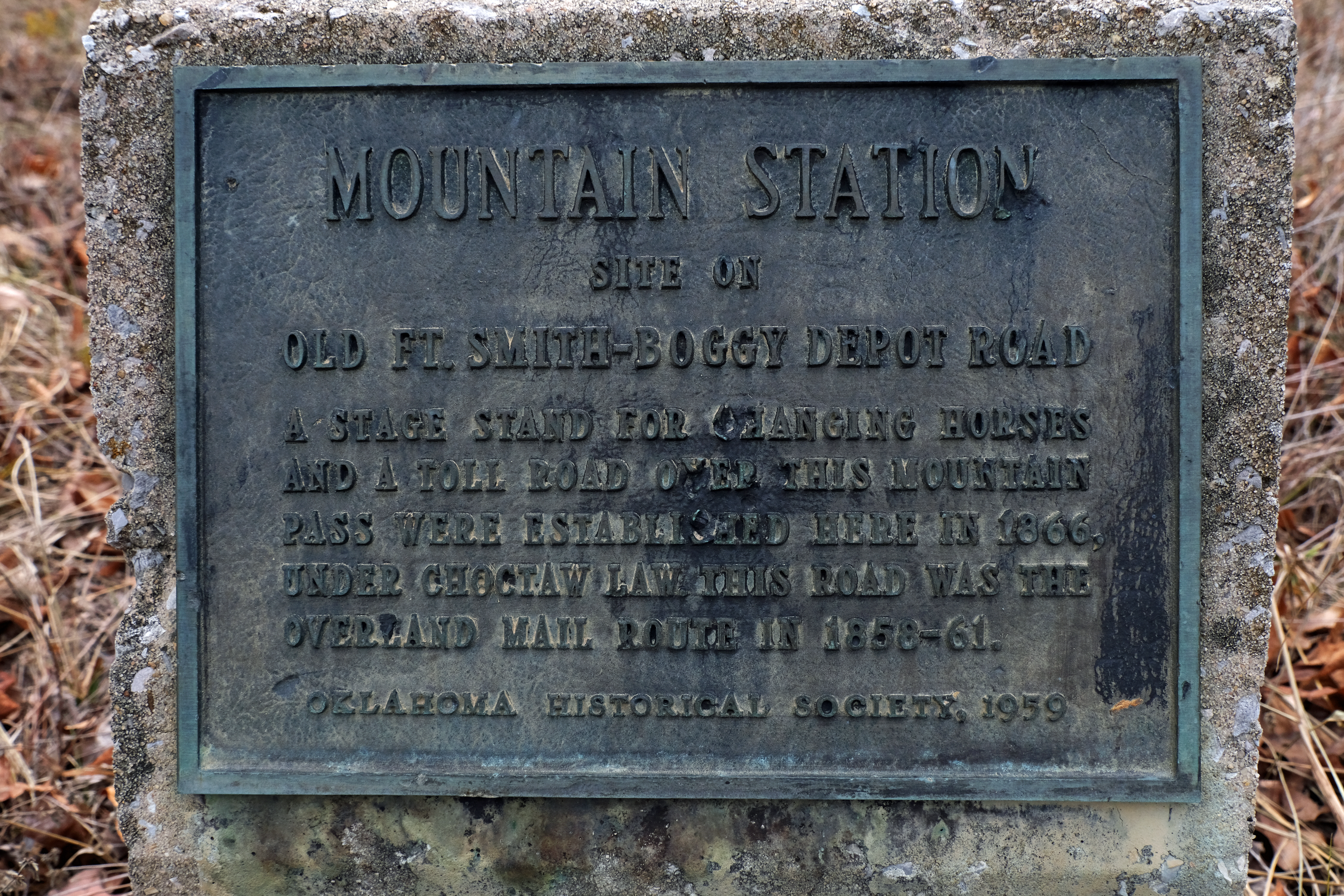 On the opposite side of the road is the 1958 Oklahoma Historical Society marker, its bronze plaque in good condition but concrete base damaged at both upper corners. The Committee located this marker due north of the grave site of station keeper Trahern, a landmark no longer evident, as the gravestone has been moved.